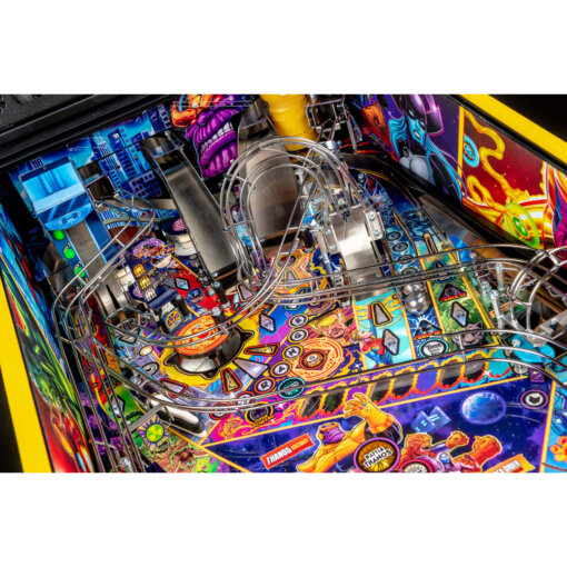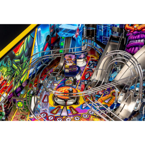 The Premium and Limited Edition models feature an interactive Dr. Strange motorized pop-up disc scoop, transporting pinballs into an underground Portal, a visible subway capable of holding and staging up to 3 balls through custom playfield windows accentuated with dynamic RGB lighting effects. These models also include a custom sculpted Thanos Infinity Gauntlet integrated with atmospheric light-up gems, a Captain Marvel inverse gravity custom wireform ramp, and a Pym Laboratories vertical up-kicker.
