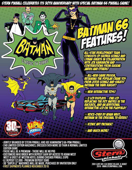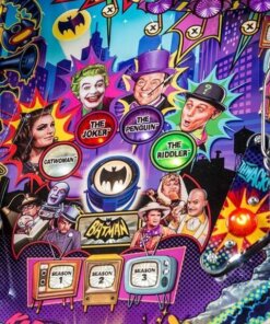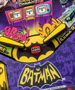 Batman 66 pinball machine features the world famous “Dynamic Duo” of Batman and Robin. The game will immerse players in campy fun and heart-pounding action as the crime fighting Dynamic Duo comes to the aid of the Gotham City Police. Throughout the game, Batman and Robin work to deduce clues and discover super villain plots in an effort to thwart evil plans and capture bad guys. Players are guided through the game by the voices of none other than the original Batman and Robin, Adam West and Burt Ward.