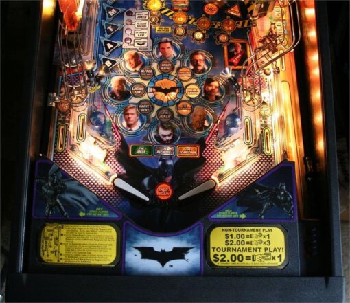Batman pinball includes villains from DC Comics Batman universe, including The Joker and Scarecrow. Features of the pinball include The Jokers Reveal Mechanism, a mechanical cylinder that rotates to reveal a taunting Joker; Scarecrows Crane, a mechanical crane featuring a spring-attach pinball which the player can strike with the pinball; and the Batmobile Bridge, a see-saw mechanism that races a pinball against a miniature Batmobile. Batman pinball also features an upper mini-playfield.