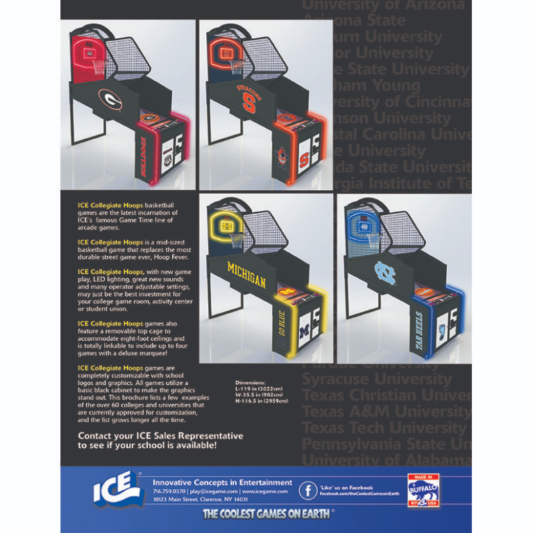 In this new mid-sized version of the ever-durable street game Collegiate Hoops boasts the latest technology such as new LED lighting, slam dunk sound effects, moving hoop, and more. See how many points you can rack up against the ticking clock! With deluxe custom marquee options available, choose from college teams to decorate your Collegiate Hoops. Perfect for any arcade, game room or family entertainment center!