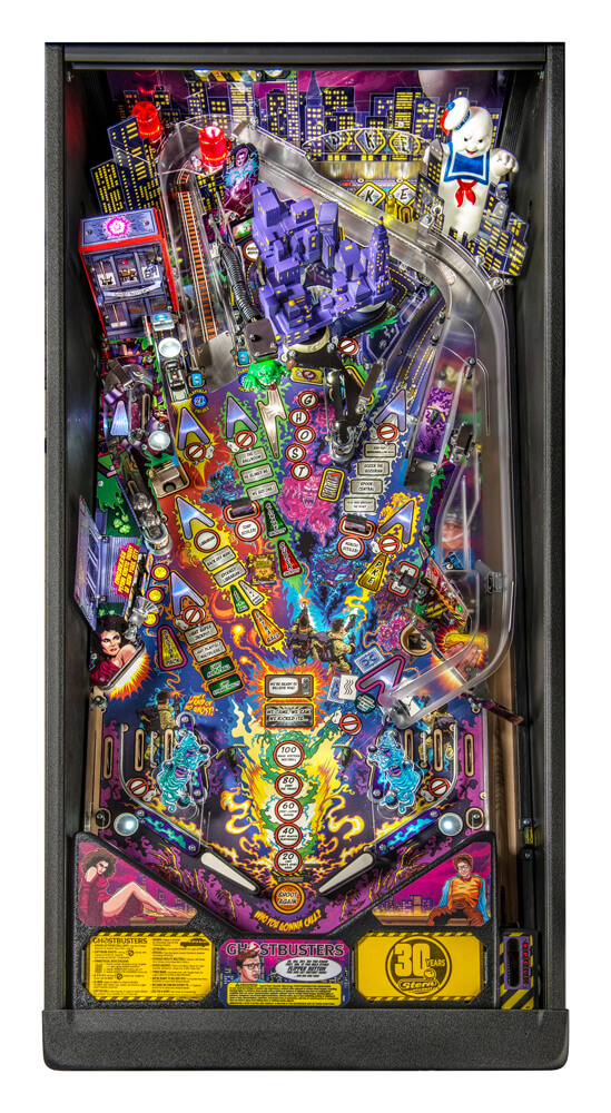 Ghostbusters pinball is designed to be easy to play but difficult to master. It features a moving interactive Slimer toy target and a fresh distinctive layout that integrates traditional pinball devices with unique multifunction two-way ramps featuring a magnetic diverter and scoring switches. In addition, the game features a modern take on a ball transfer target, combative open field drop targets, a ball eject target, a captive ball target and custom molded toys.