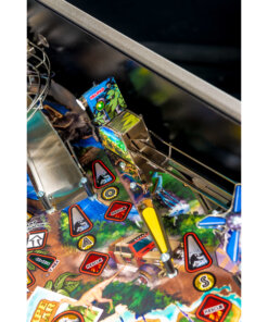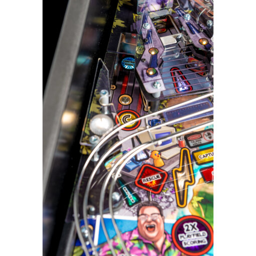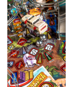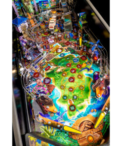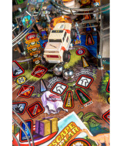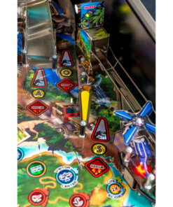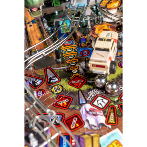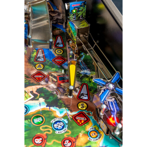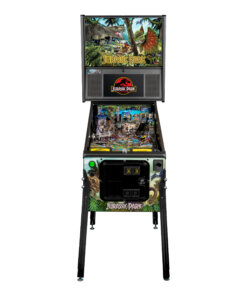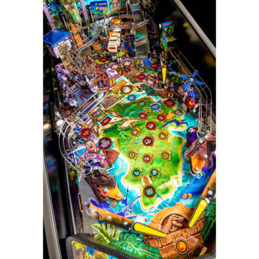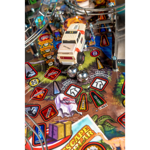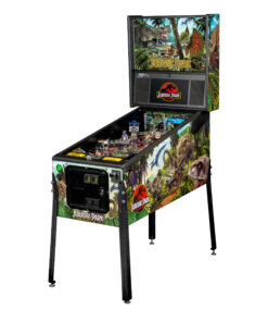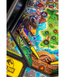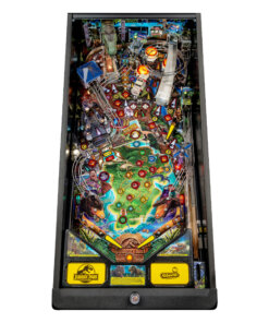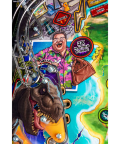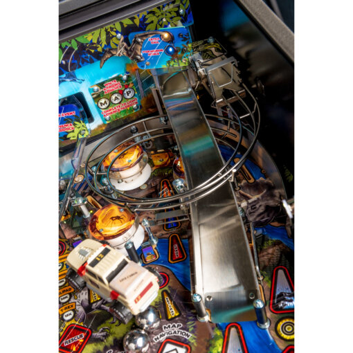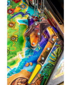 The Pro, Premium, and Limited Edition models also feature a Jungle Adventure Vehicle target in the middle of the playfield that is a spinning Newton Ball. This kinetic target registers direct hits, determines the direction players navigate on the island during gameplay, and lights T. Rex modes. All models include three full sized flippers, four custom ramps, a spinning “Spitter” target, in-lane up/down lock post that sets up critical playfield shots and distinctive hand-drawn art highlighting iconic dinosaurs from the series.