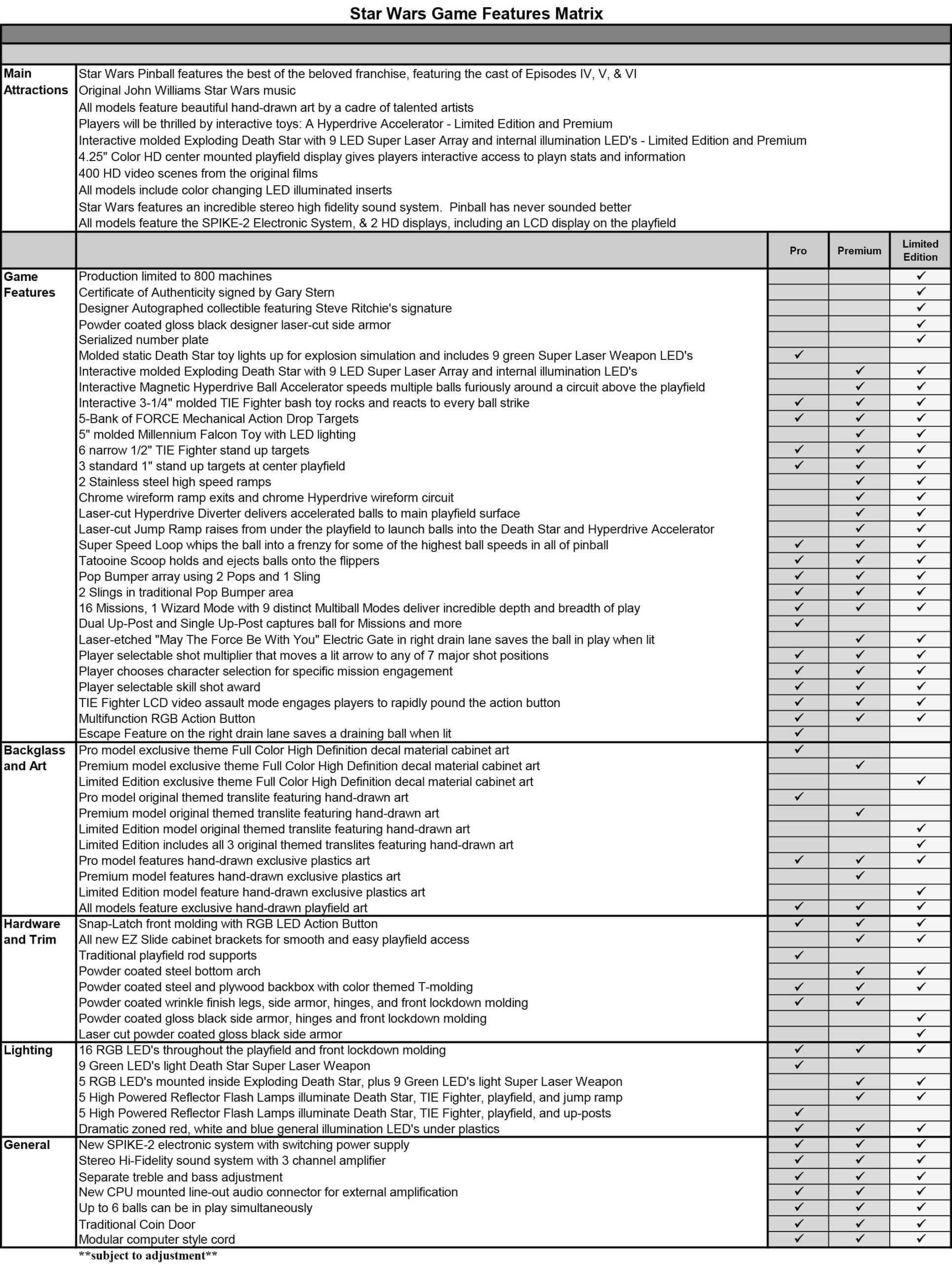 The Star Wars themed Comic Art Pro and Star Wars Comic Art Premium machines made by Stern are packed with features that provide an irresistible game experience. The game includes select dialogue and footage from the original Star Wars trilogy, color-changing LED-lighted inserts, and a sculpted TIE fighter. All models feature two LCD screens. The Premium model also features art representing an exploding Death Star, a sculpted LED-lit Millennium Falcon and an interactive hyperspace loop that encircles the playfield and can accommodate up to 5 pinballs at once.