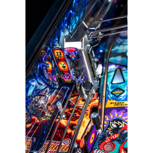 Playing as Venom, gamers will select a host to bond with at the start of each game, altering the entire gaming experience both physically and digitally. Vertical pinball lock symbiote containment vessels located on both sides of the playfield lock and quickly release balls for constant frenetic action as players explore shots through the mechanically changing Agro-Lab and Life Foundation pathways. Players will bash an interactive, custom sculpted Carnage captive ball back into Ravencroft Institute for the Criminally Insane. Additionally, a surprise Doppelganger attack can swing into action at a moment’s notice, unveiling three uplift targets wreaking chaos.