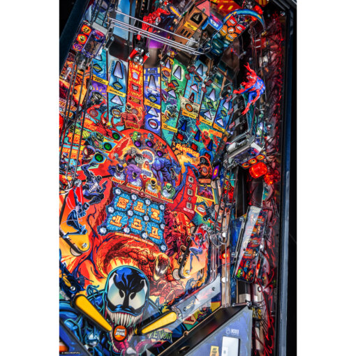 Limited to 1,000 games globally, the highly collectible Limited Edition model includes a Venom vs. Carnage inspired full-color mirrored backglass, full color high definition reflective foil decal cabinet artwork, custom high gloss Venom-inspired “goo” powder-coated pinball armor, a custom designer-autographed bottom arch, inside art blades, upgraded audio system, anti-reflection pinball playfield glass, shaker motor, a sequentially numbered plaque, and a Certificate of Authenticity signed by Stern President & CEO Seth Davis.