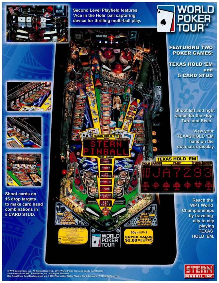 Texas Hold ‘Em poker deals the silver ball another great hand with World Poker Tour pinball machine from Stern Pinball. Based on the hit television series that airs on the Travel Channel®, WORLD POKER TOUR pinball brings new levels of excitement, challenge, and understandability for both the novice and the skilled player.